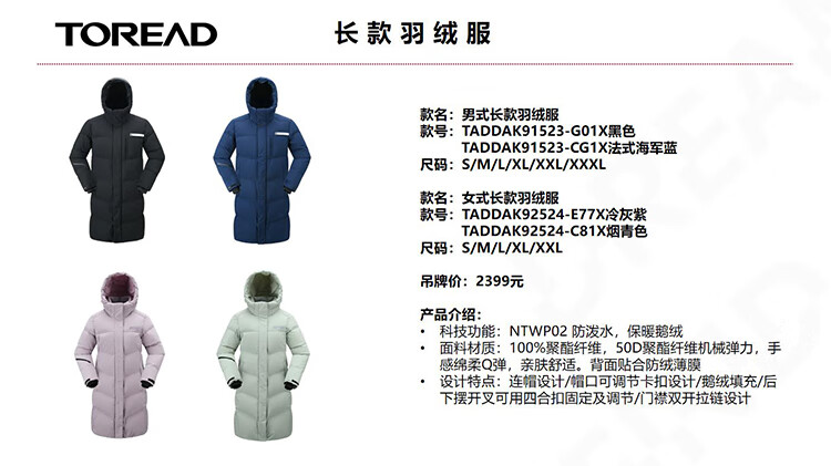 探路者男式长款羽绒服